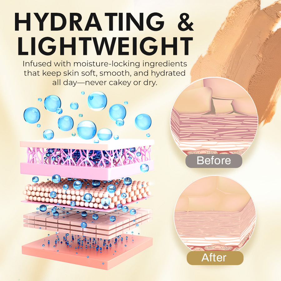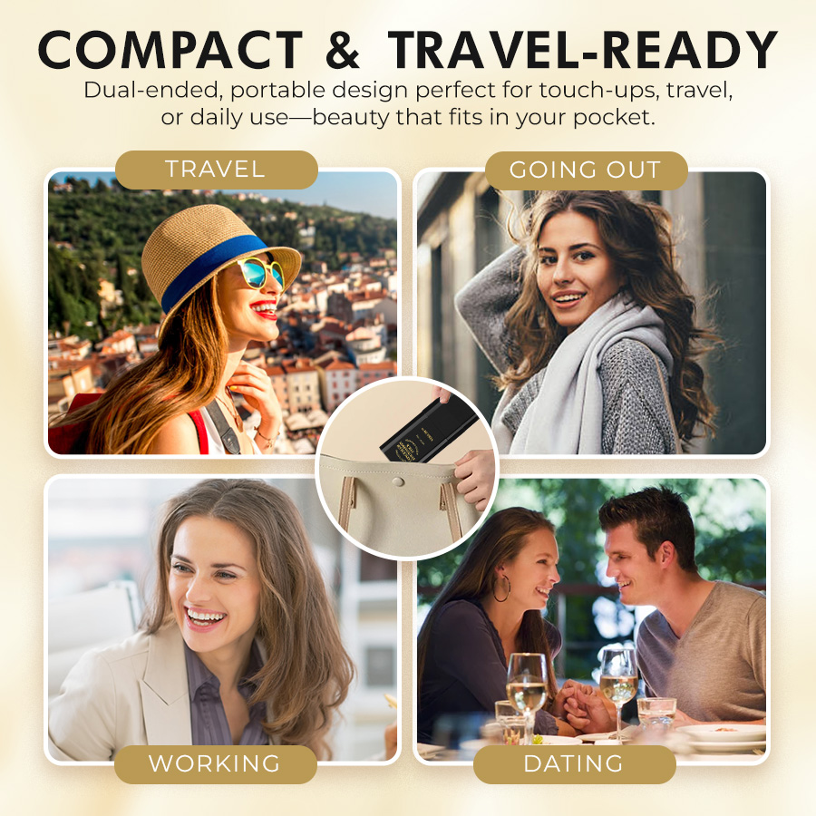 Ditch the messy pumps, the separate beauty blenders, and the complicated routine. This is your effortless shortcut to radiant, confident skin—always on point, always on the go.